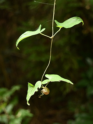 これはヤマノイモの蔓。先端にムカゴが付いていますね。葉が対生に付いているのもヤマノイモの特徴です。(よく似るタチドコロなどは互生)