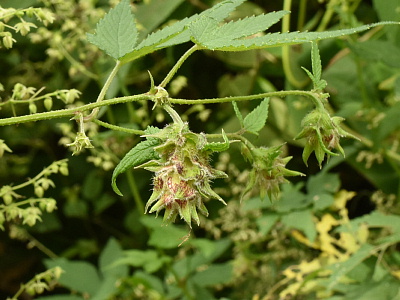 こちらはカナムグラの雌花序。花粉の受け手ですね。まるで鎧のようです。カナムグラの茎(蔓)には硬く短い刺が下向きに密生していて、指でなぞることもできないほど。これを他の植物に絡めて四方八方に伸びて行くという手法です。