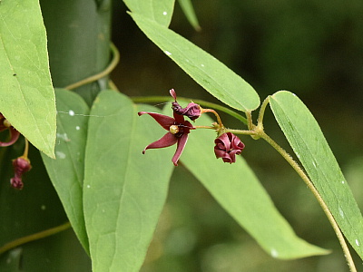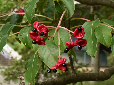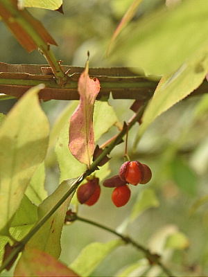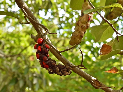 この毒々しいものはゴンズイの果実、実の部分(果皮が肥大したもの)が開裂して、黒い種子が露出しています。これが完熟の状態。この種子、落ちそうで落ちないんですよね。