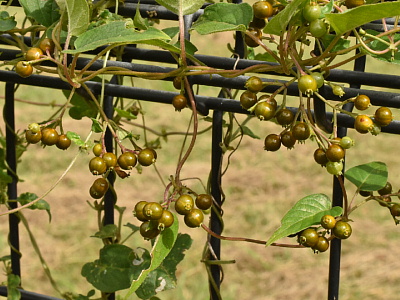 フェンスに絡みつくヘクソカズラ。丸いのは果実です。完熟までもう少しといったところでしょう。リースの部材に使えそうですが、すぐにバラけてしまってなかなか上手くいきません。