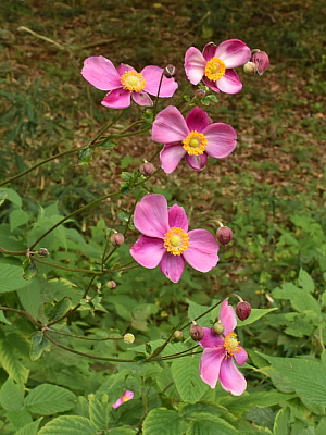 ドッグランの近くに植栽されているシュウメイギクの園芸品種。見た目もキクに似ていますがキクの仲間ではありません。自生のものは古い時代に中国から渡来。萼片(花弁のようにみえるもの)の数は30個程度あるそうです。ダリアみたい。