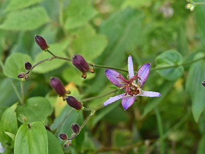 ホトトギスが咲き始めました。もしかしたら園芸的に手が加えられたものかもしれません。弾丸のようなものは蕾です。