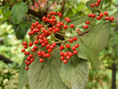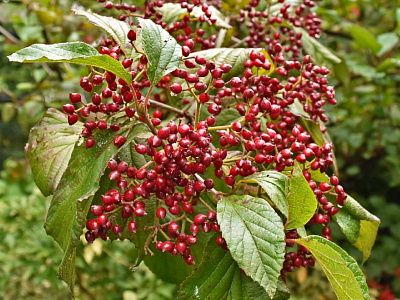 ガマズミの実が色づきました。写真のように深い紅色になるものと、次の写真のように朱色になるものがあります。両者は同じものなのか、単なる株ごとの個性なのか。それとも熟していく過程の異なる姿?