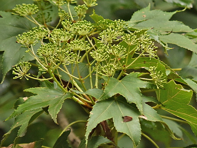 ハリブキの若い果実です。高木になるものが多く、いつも見上げるアングルになってしまい、観察に苦労します。実の付き方がなんとなくヤツデに似ていますね。同じウコギ科に属しています。