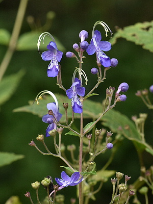 息が長いカリガネソウの花。なかなかスタイリッシュですね。もうこの時期には果実ができ始めています。写真下部の4つ寄り集まっている球形のものが果実です。