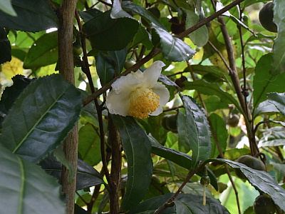 チャノキの花です。たくさんの雄しべが特徴で、必ず俯いて咲きます。