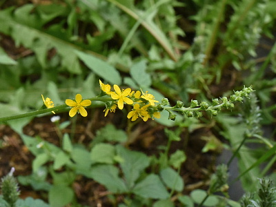 キンミズヒキの花序。花は根元側から咲いていくようです。花が終わった後にできる果実は、お馴染みのひっつき虫。気が付くと運動靴の紐の部分にびっしり付いていたりします。