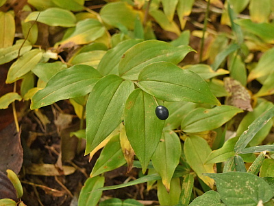 こちらはチゴユリの実。茎頂に黒く熟す実を1個付けます。