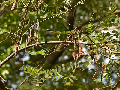 ハリエンジュの果実がぶら下がっていました。枯れているようにも見えますが、これが熟した状態。鞘の中に扁平な種子が数個入っています。