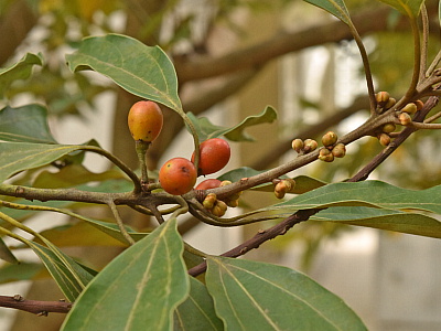 シロダモ。赤く熟しているのは去年結実した果実。シロダモの果実は翌年の秋に成熟します。同じ枝に付いている粒々は今年の花芽。もうじき開花です。
