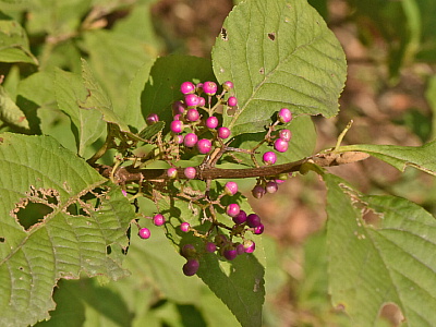 代わってムラサキシキブが実を結ぶ時期になりました。民家の庭先などでよく見かける実がびっしりと付くものは、園芸用に手を加えられたコムラサキです。ムラサキシキブの疎らな実の付き方も、虫喰いの葉と相まって、野趣があって良いものです。