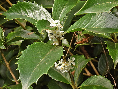 尾根道沿いに植栽されているヒイラギモクセイ。花はヒイラギにそっくりです。見分け方は葉の棘の数。ヒイラギは棘が2〜5対ありますが、ヒイラギモクセイの場合は8〜10対です。