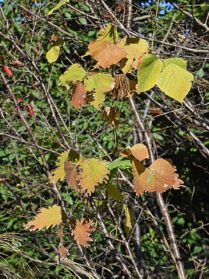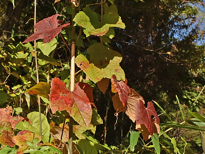 さりげなく蔓を垂れているのはクズ。こちらはグッと渋い感じの黄葉です。侘び寂びに通ずる何かを感じるのはyamanekoだけ?