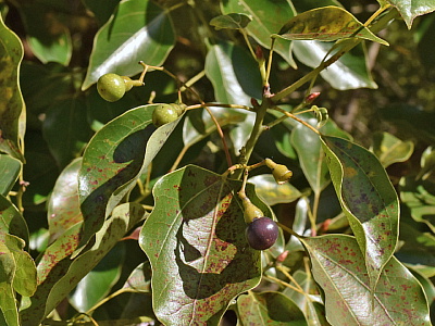 秋の陽を浴びているのはクスノキの実。果実は球形で、盃のような形の果床にくっついています。写真の黒い果実の上の方に実が落ちた後の果床が残っていますね。