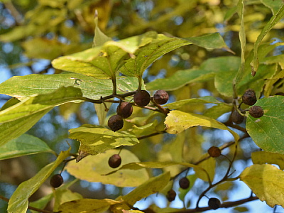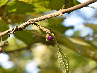 エノキの実が熟しています。若い実は硬いですが、熟すと果肉部分が乾燥し縮んで、表面の果皮に皺というか凹みが出ます。味は甘いですが、いかんせん果肉の量が少なすぎ。