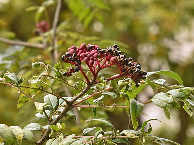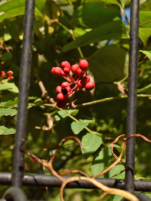 数年前に剪定されてすっきりし過ぎる樹形となったイヌザンショウ。でも花や果実はちゃんと付けれくれています。赤い色のものが果実で、黒くつやのあるものはその果肉に包まれていた種子です。