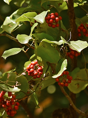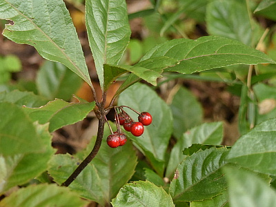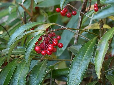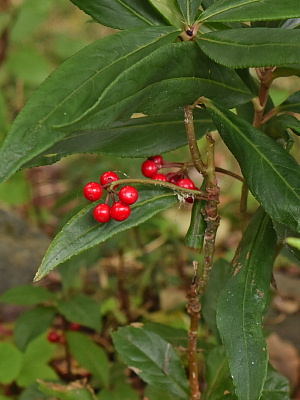 野草見本園へ。これはマンリョウの実。緑色の葉に赤い実がお目出たいと、昔から正月飾りに使われます。