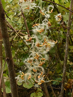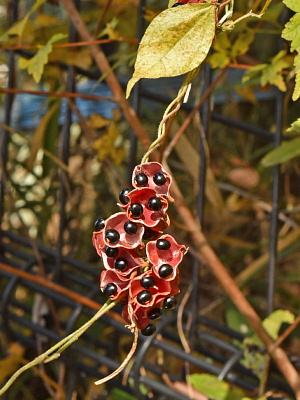 トキリマメの果実が鈴生りに。エンドウ豆の実を寸詰まりにしたような姿をしていて、それがぱっくりと開き、中の種子(豆)が露出しいている状態です。これが完熟状態。