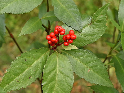 サンショウの実が赤いというのはあまり知られていないのでは。通常は夏前にまだ緑色の実を収穫することが多いようです。