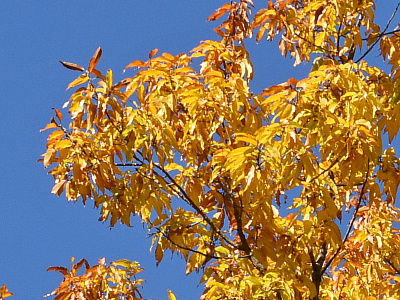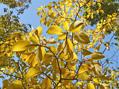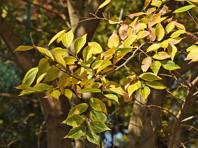エノキも黄葉し始めました。今はまだ緑色がかっていますが、黄葉が進むと真っ黄色になります。「黄色」って元は「木色」だったりして。