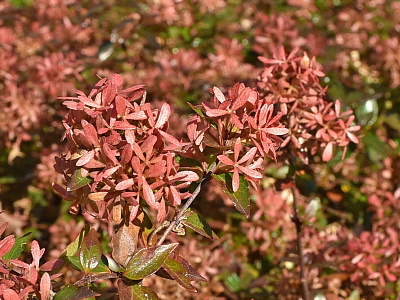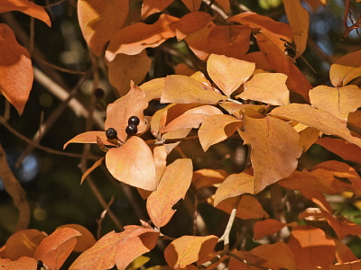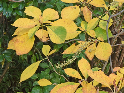 こちらはしっとりとした色合いの黄葉。リョウブです。果穂が伸びていますね。大昔にはこの実を救荒作物として、植えることが奨励されたのだとか。リョウブを漢字で「令法」と書くのはそれを法令で定められたからだそう。でもなんで「法令」ではなく「令法」?
