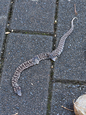 散策路にこんなものが。これはぺちゃんこになったマムシです。でもこの道は歩行者か自転車くらいしか通りません。どうやってこんなに万遍なく平らに潰されたのでしょうか。