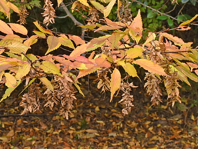 黄葉も木によって様々です。これはアカシデ。ぶら下がっているのは枯葉ではなく果穂です。果穂には果苞と呼ばれる小さな翼のようなものが連なっていて、その果苞の付け根に果実が付いています。