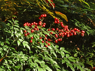 枯れ色の中で緑色の葉を見たらなんだかほっとしますね。このナンテンもそうですが、センリョウやマンリョウなど緑色の葉に赤い実の取り合わせがお目出たいとするのは、そこに生命力を感じるからなのではないでしょうか。