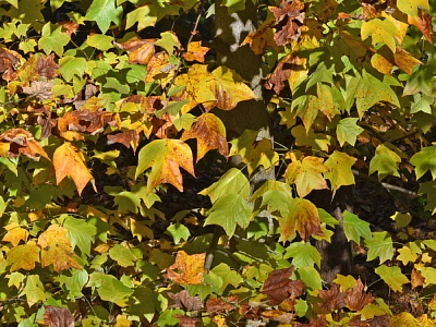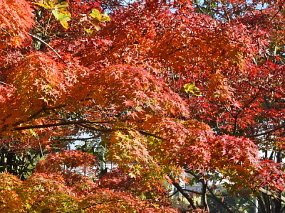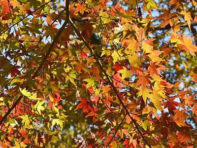 イロハモミジです。単一の色に紅葉するものも見事ですが、このような色づき方も奇麗です。