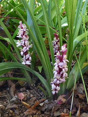 野草見本園のキチジョウソウ。根際に花序があるので、カメラもローアングルです。お目出たいことが起きたときに花を付けるという言い伝えから吉祥草の名を持っています。