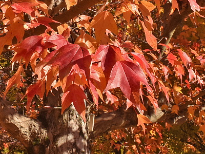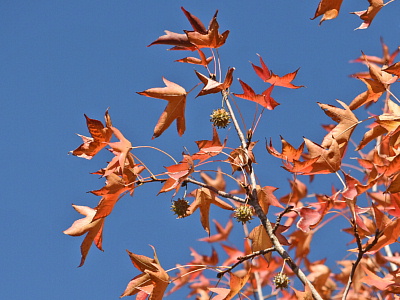 モミジバフウ。鮮やかな紅葉に目が行きがちですが、球果がぶら下がっているところにも注目です。
