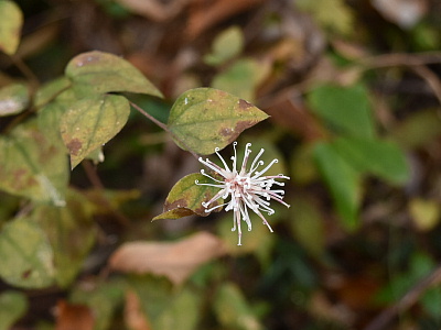 コウヤボウキ。長い花茎の先端に1つだけ頭花を付けます。頭花を構成するたくさんの舌状花は先端が巻いていて、吹き戻し(吹くとピューと伸びて、ピロピロピロと巻き戻るやつ)に似ています。
