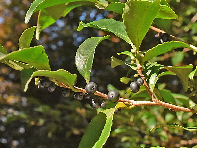 ヒサカキの果実が黒く熟していました。小枝には来年の花芽も付いていますね。
