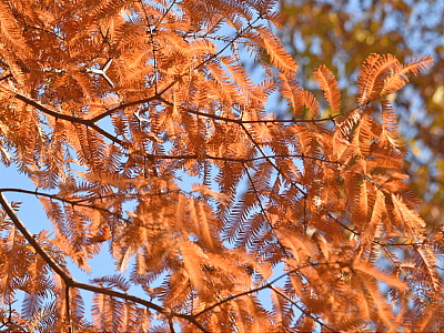 メタセコイアの葉は一見とげとげしいですが、触ってみると柔らかく、まったく痛くないです。この葉のように見えるものは、正確には側枝と呼ばれ、葉の集合体。本来の葉は長さ2、3cm、幅1mmほどで、これが奇麗に並んで側枝を形作っています。