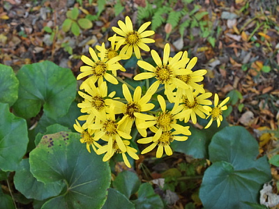 初冬の花、ツワブキ。大きく丸い葉がテカテカしています。ツヤのある蕗が転訛してツワブキなんですね。ところで、この季節に花を訪れてくれる虫はいるのでしょうか。
