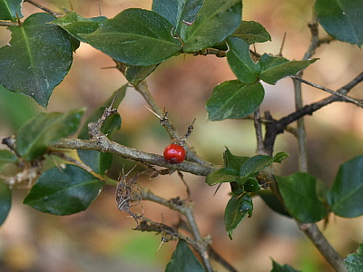 こちらはアリドオシ。枝に鋭い刺があり、これが蟻をも突き通すほど鋭いということのよう。アリドオシはセンリョウ、マンリョウになぞらえて「一両」と呼ばれることもあります。野草見本園では、これらの周囲にセンリョウ、カラタチバナ(百両)、ヤブコウジ(十両)も植えられています。
