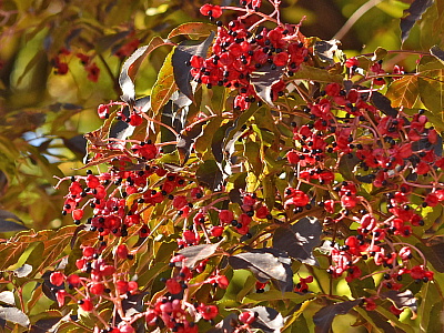 色づき始めたエビヅル。晩秋になるとまさに葡萄(えび)色になります。で、その葡萄色とはやや紫を帯びた暗い赤。語源は山葡萄(やまぶどう、別名えびかずら)だそうですが、よく似た色に伊勢海老の色を語源とする「海老色」(えびいろ)というものもあって、元々は別の色のことだったそうです。今は混同されることが多いとか。