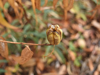これはヤマユリの刮ハ。これから3つに開裂し、中に詰まっている薄い種子がバラまかれます。写真はその前段階として果皮が少し開いて網目状の隙間ができている状態。これは中に風を取り込んで、種子の乾燥を促すためなのでは(yamaneko説)。