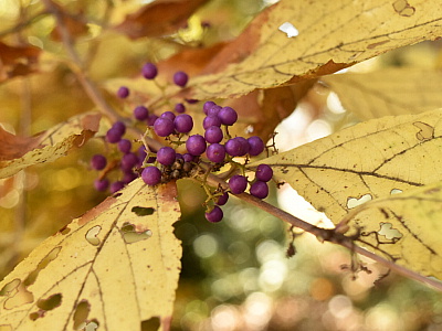 ムラサキシキブの実は熟し、そろそろ枯れていくところです。この先、まず葉が落ちて、実はもうしばらく枝に残ることが多いです。
