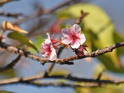 毎年いち早く春を告げるカワヅザクラ。なぜか数輪花を付けていました。おまけに若い葉もちらほらと。季節を間違えたようです。