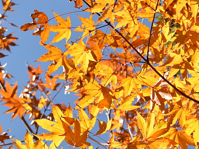 イタヤカエデの黄葉。カエデの仲間には似た者同士が多く、例えばこのイタヤカエデはオオモミジによく似ています。ただ、春に花を見ると一目で見分けることが可能。オオモミジは花序が垂れ下がりますが、イタヤカエデは花柄が立ち上を向いて咲きます。