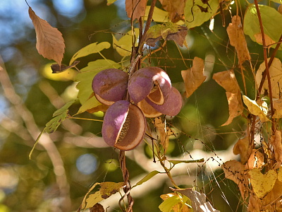 おお、ミツバアケビの実だ。子供の頃には秋の山遊びのおやつでした。甘くて美味しいんですよね。ちょっとしたスイーツ並みなのですが、可食部が脆く市場での流通は難しいです。と思っていたら、何年か前に群馬県片品村の道の駅で売られているのを見ました。実が開裂する前のものでしたが。「アケビが売り物になるなんて…」と軽く衝撃を受けつつも、買って帰りました。