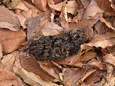 これはクマの落とし物、ではなく、ホオノキの集合果です。つまり果実が集まったもの。大きさはコッペパン(死語?)くらいです。