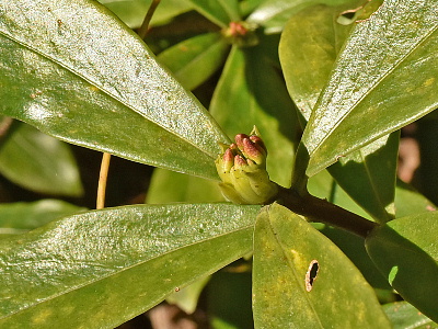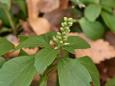 去年自生場所を見つけ、ササ刈りなど保護策を施したフッキソウの群落。今年も継続して追い刈りをしました。すると花序を付けている株が1株ありました。保護の効果が出て良かった。春の開花時期が楽しみです。