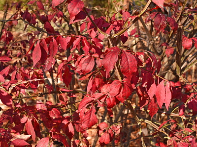 大田切池の手前の広場にはニシキギが植栽されています。この木の紅葉は他の木の紅葉よもり一段深い紅色をしています。錦木の名に恥じない色合いです。
