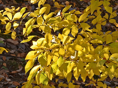 これはクロモジの黄葉。涼やかです。黄葉にもオレンジ色系もあればこのクロモジのようにレモン色系もあります。ミズキなどもレモン色系ですね。