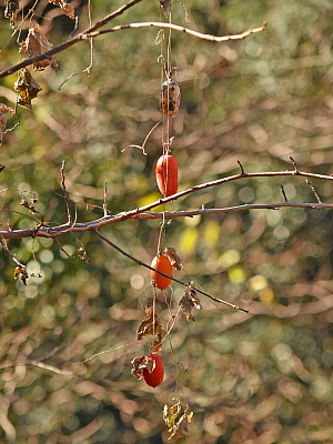 ツルウメモドキの果実。赤いのは仮種皮で、その中に小さな種子が入っています。殻との色の組み合わせがいいですね。