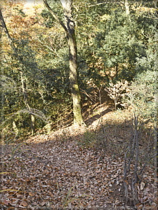 落ち葉で隠れ気味ですが、これがチャート。地層が50度くらい傾いていますね。岩石としては極めて固く、ちょっとやそっとでは傷がつかないのだそうです。確かに破砕面が瑪瑙(めのう)とか大理石のような質感ですね。成分は二酸化ケイ素で、太古の海で放散虫の殻などが堆積してできたものだそう。褐色のものから緑がかったものまで色々あるそうで、そういえば10年くらい前に登った行道山(同じ足利市にある)で緑色を帯びたチャートを見た覚えがあります(こちら)。