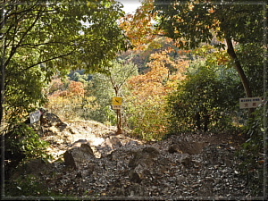 1時30分、男坂・女坂の分岐まで下りてきました。真っすぐ行って岩場の縁から崖を下るルートが男坂。右手の日陰になっているところから斜面を斜めに下るのが女坂です。ここは女坂へ。