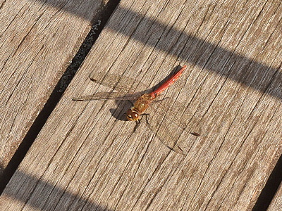 ベンチの上に少し憔悴したようなアキアカネが。近づいても逃げようとしません。もうそろそろ一生を終える頃ですが、今年生まれたアキアカネは特に大変だったでしょうね。もともと夏は高山で過ごすのですが、酷暑の夏にはより標高の高いところまで移動して夏を過ごすのだそう。長距離移動が身に堪えているのかもしれません。